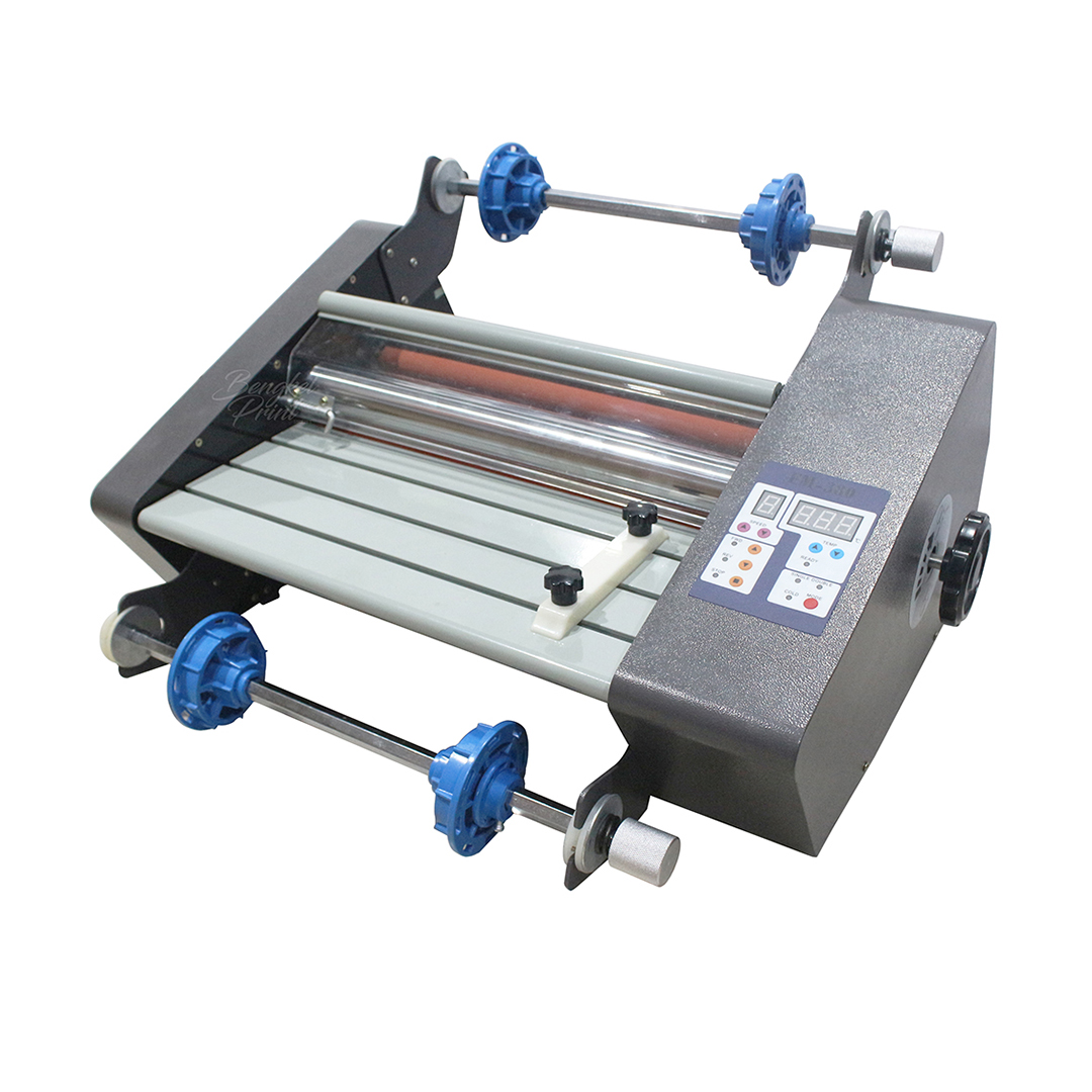 Mesin laminating roll ini untuk laminasi dua sisi (atas dan bawah untuk plastic roll). Proses laminasinya panas dan dingin, dilengkapi temperature meter serta pengatur kecepatan (speed adjuster). Mesin laminating roll ini berkualitas cukup baik dengan hasil laminasi yang memuaskan baik untuk glossy maupun matte. Bisa diaplikasikan untuk laminating kartu nama, undangan, brosur, dan lain sebagainya.