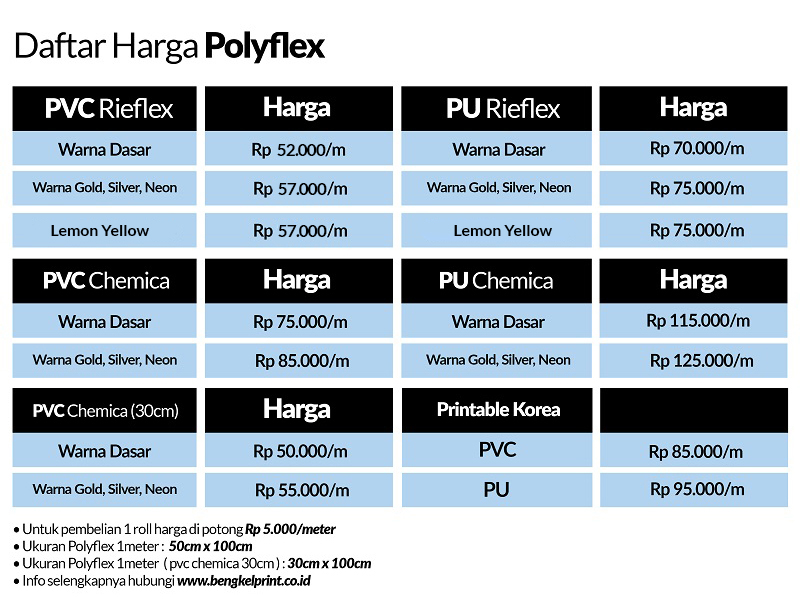 Tersedia bahan poliflex made in Korea (PVC) dalam ukuran rol. Untuk 1 rol ukuran 25m. Untuk lebar polyflex itu sendiri adalah 50cm.
